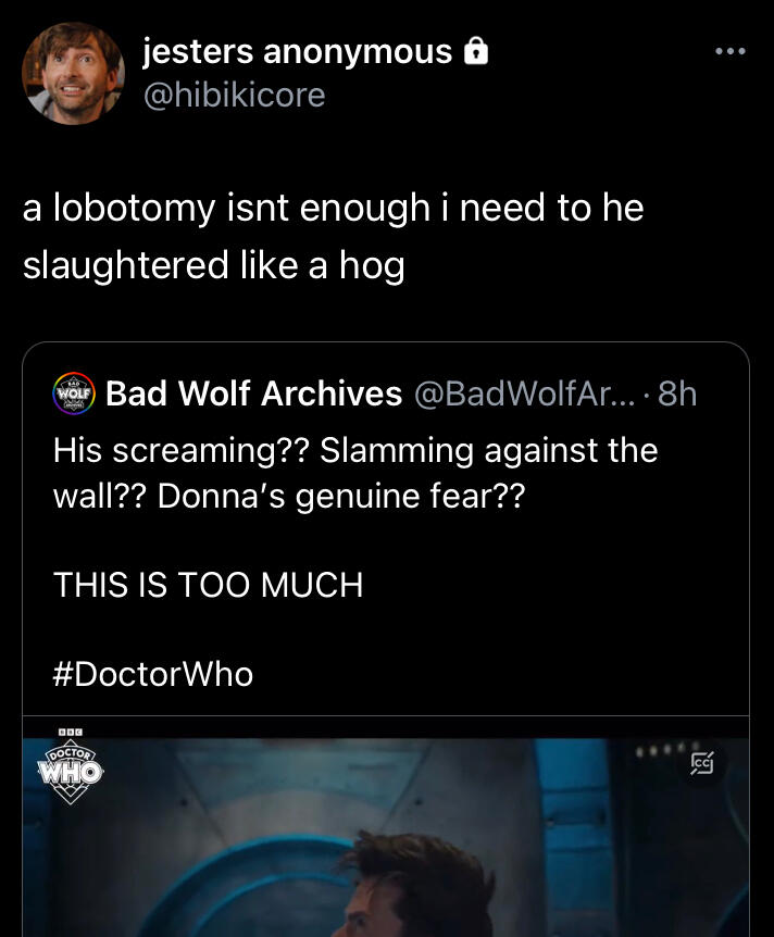 the 60th anniversary specials couldn’t come sooner. i will finally have them back after 15 years. if RTD does the damn thing and kills donna i think there will be riots all over the UK lmfaoif y’all are curious as to what my main take away from the 60th anniversary specials trailer was, this tweet sums it up rather well. enjoy